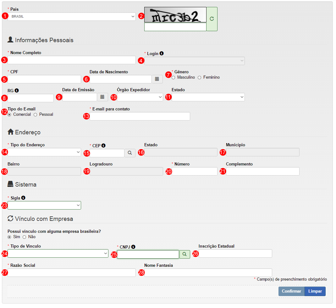 - No campo Captcha digite os caracteres apresentados na imagem. Este dado aumenta a segurança do seu cadastro. Caso tenha dificuldade em identificar os caracteres, clique no ícone