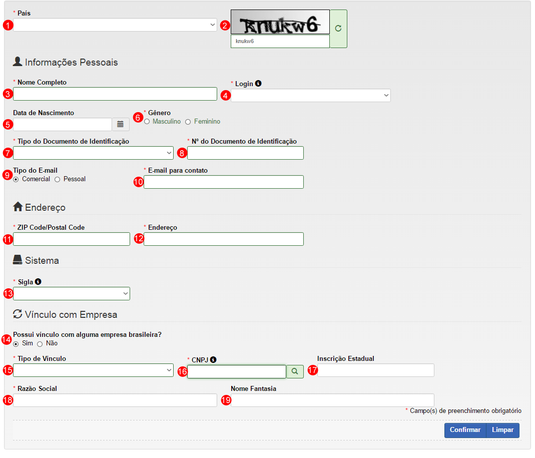 - No campo Captcha digite os caracteres apresentados na imagem. Este dado aumenta a segurança do seu cadastro. Caso tenha dificuldade em identificar os caracteres, clique no ícone