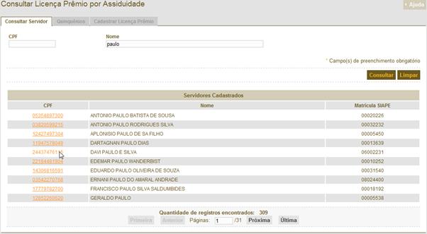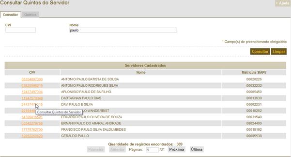 – Consultar Quintos do Servidor